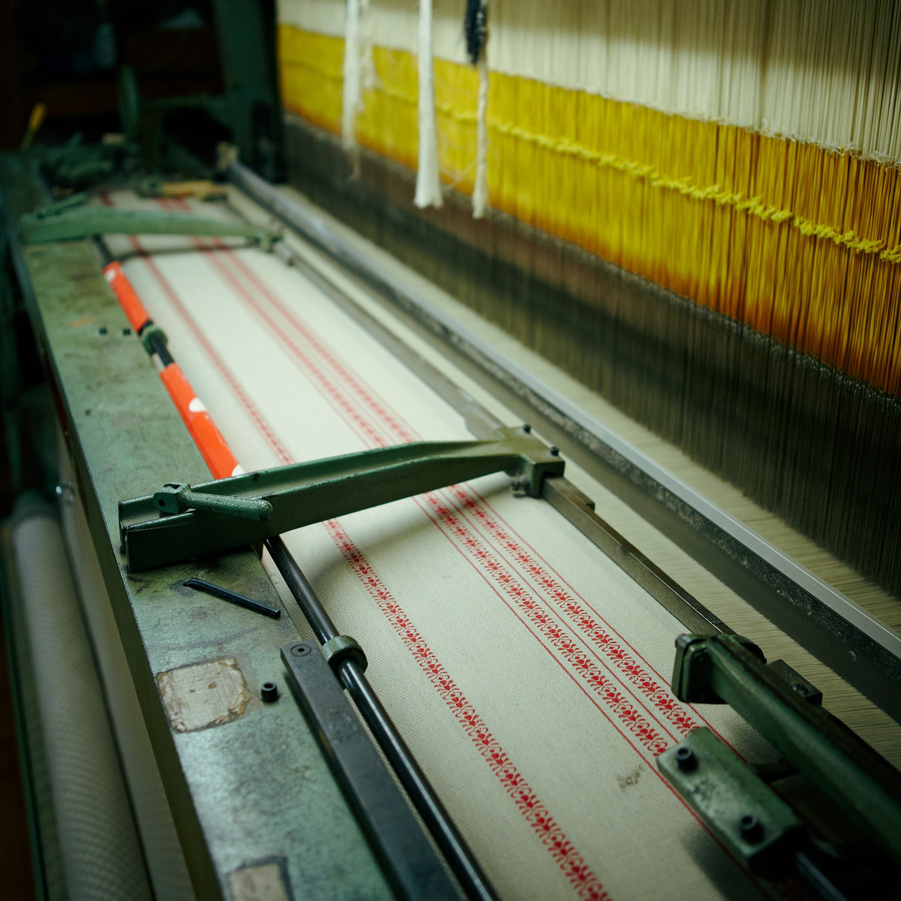 古いシャトル織機で丁寧に生地を織り続けています。